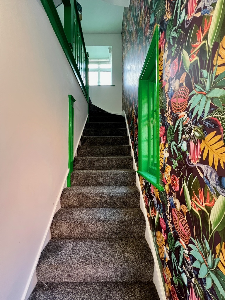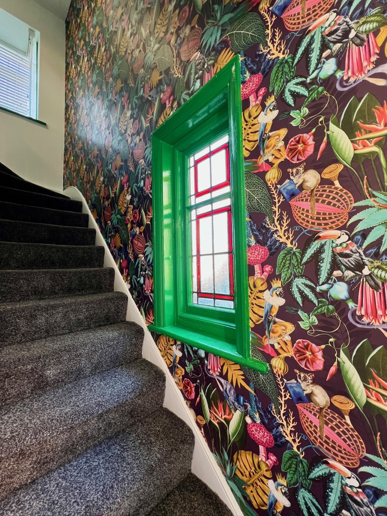 Step into a world of vibrant tropical luxury at The Safari Loft, a uniquely stylish split-level apartment moments from the heart of Wembley. The flat is designed with a striking safari theme, featuring bold jungle-print wallpapers, vivid colours, and exotic animal motifs that guarantee a memorable stay. The sleeping arrangements are generous: the first floor hosts the luxurious main bedroom with a plush king-size bed, alongside the living room which is equipped with a comfortable double sofa bed. A separate staircase leads to the fun, bright Twin Bedroom on the upper floor, complete with two single beds.